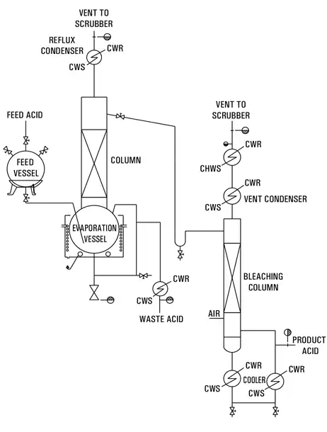 The process to purify industrial/technical grade nitric acid involves a single stage distillation to leave non- volatile impurities in the still bottoms. 69% – 70% concentrated nitric fluid is delivered by means of a metering pump from a storage tank into the glass still which is equipped with Electrically heated Oil Bath. The acid vapors flow through a mist removing packed section to the Glass condenser. Depending on the desired concentration high pure water can be added as a diluent to the condensed product before entering the bleach column. Clean air is introduced at the base of the bleacher. Air and oxides of nitrogen are vented through a condenser to a scrubber. Entrained nitric acid is not returned to the bleaching column but collected separately. Removing of all NOx out of electronic grade nitric acid.